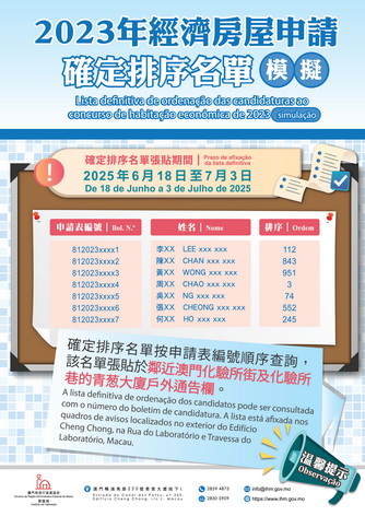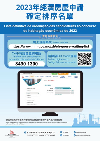 房屋局表示,申請人可透過房屋局網頁的排序查詢系統(www.ihm.gov.mo/zh/eh-query-waiting-list)、微信及24小時語音電話(8490 1300)查詢申請情況。2023年經濟房屋申請的臨時排序名單於2024年11月13日公佈。自2024年11月13日至28日期間,房屋局共收到95份由申請人提出的聲明異議,經處理有52份轉為獲接納的申請,其餘維持被取消申請資格。