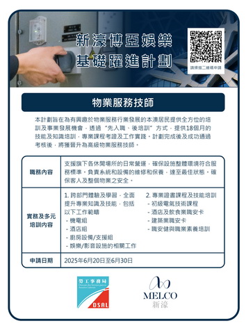 【本報消息】為有意投身物業服務範疇的本澳居民,提供全方位的培訓及事業發展機會,勞工事務局和新濠博亞合作推出「新濠博亞娛樂基礎躍進計劃—物業服務技師」,以「先入職、後培訓」方式,為有興趣從事物業服務範疇的本澳居民,提供全方位的培訓及事業發展機會,計劃由即日起接受申請。