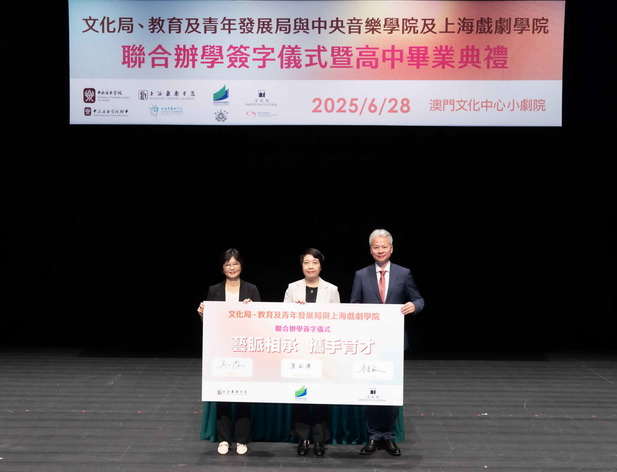 【本報消息】文化局、教育及青年發展局與中央音樂學院及上海戲劇學院於上周六在澳門文化中心小劇院舉辦聯合辦學簽字儀式,同日並舉行文化局澳門演藝學院舞蹈學校第八屆舞蹈職業技術高中畢業典禮,以及音樂學校第12屆音樂職業技術高中畢業典禮,一眾嘉賓、師生、家長出席及見證。