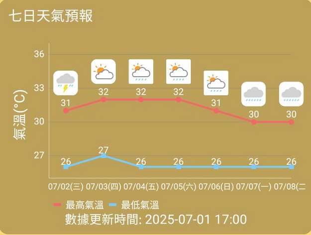 根據當局的七日天氣預報,經過中後期連續多日高溫達32度的酷熱天氣後,下周一的「小暑」節氣氣溫反而會稍為降至26度至30度,並會轉為大致多雲且有幾陣驟雨的天氣。