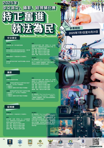 【本報消息】為傳揚澳門保安部隊及保安部門人員秉持正直奮進的精神履行職責、執法為民,展示積極向上的警隊文化。澳門保安部隊及保安部門今年續舉辦中文徵文和攝影比賽,並新增設短視頻比賽,三項比賽均以「持正奮進、執法為民」為主題,呈現澳門保安部隊及保安部門人員在現今複雜多變的社會環境下,堅守正直無私、奮勇前進的信念,秉公執法為民。比賽由7月1日至10月31期間接受報名,歡迎踴躍參加。
