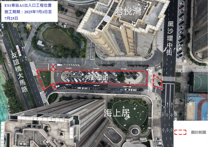 配合施工,7月3日至12月31日,如意廣場、友誼橋大馬路與黑沙環中街之間的一段勞動節街實施有限度通車,如意廣場及勞動節街部份咪錶泊車位暫停使用;7月14日至12月31日,勞動節街近黑沙環中街的電單車泊車位暫停使用;而工程範圍之休憩區則暫停開放。