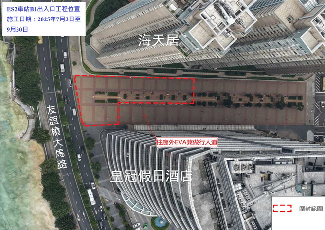 是次三個出入口工程分別是位於勞動節街的ES2站A1出入口、位於東方明珠街的ES2站B1出入口以及位於如意廣場的ES1站E出入口,將自七月起分階段施工。首階段會進行管線遷移、地下管線鋪設、重整行車道及依照市政署指引及要求對合適的樹木進行遷移等。