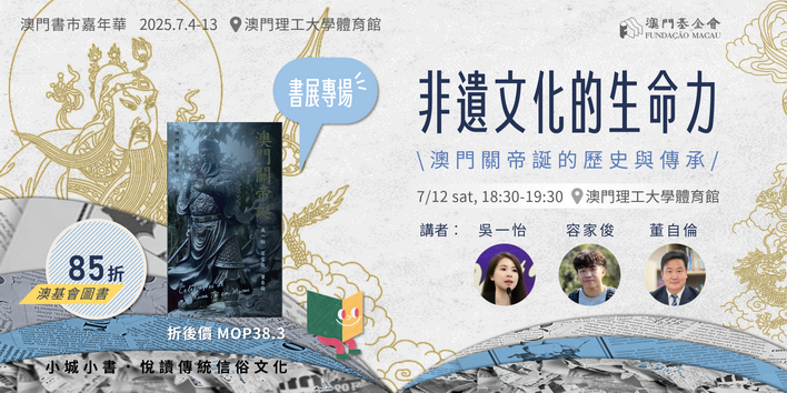 是次舉辦的「非遺文化的生命力:澳門關帝誕的歷史與傳承」書展講座邀來該書的三位作者吳一怡、容家俊、董自倫親臨現場,介紹澳門關帝信仰的歷史淵源、關帝誕的慶祝群體及其活動,以探討關帝誕在澳門的傳承與發展,展現非物質文化遺產歷久彌新的獨特魅力。講座將於7月12日下午六時半至七時半於理大書展講座區舉行,名額有限,先到先得,歡迎市民踴躍參與,如有查詢,可電郵至da_info@fm.org.mo。