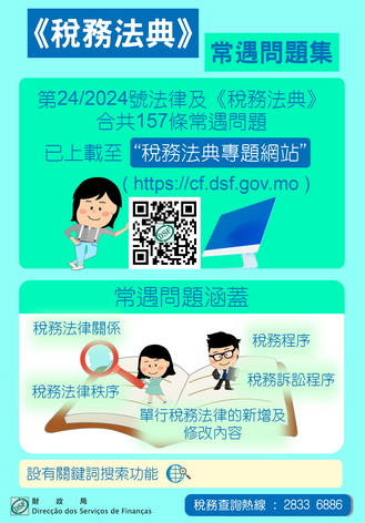 【本報消息】第24/2024號法律《核准〈稅務法典〉》將於2026年1月1日起全面實施,為了加深居民對法典內容的了解,財政局已將《稅務法典》常遇問題輯錄成集,並上載至稅務法典專題網站(cf.dsf.gov.mo)供市民瀏覽。