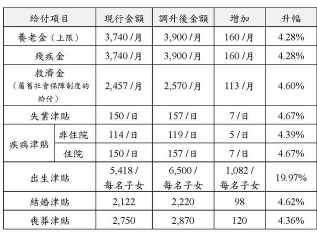 調升後,養老金上限及殘疾金由原來3,740澳門元/月調升至3,900元/月、失業津貼調升至157元/日、疾病津貼中住院津貼調升至157元/日,非住院津貼調升至119元/日、出生津貼調升至6,500元、結婚津貼調升至2,220元、喪葬津貼調升至2,870元,效力追溯至今年1月1日。