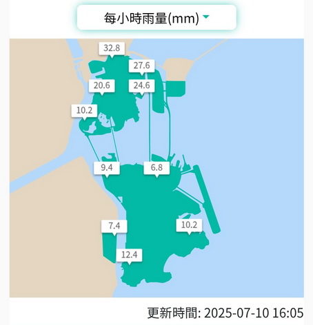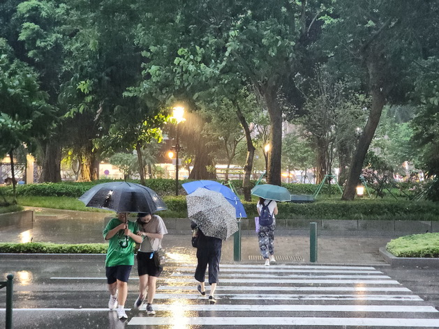 【本報消息】受「丹娜絲」殘餘環流相關的一道低壓槽影響,珠江口一帶降雨不斷,本澳亦不時出現大驟雨,氣象局日間兩度發出黃色暴雨警告,其中下午時份降雨主要集中在北區,孫中山市政公園監測站一個小時內錄得降雨量逾30毫米。當局預料本澳周五至周六初時天氣仍然不穩定,驟雨頻密且雨勢有時頗大,要提防短時強降雨下低窪地區可能出現水浸,預測周六稍後雨勢始逐漸減弱;下周初至中期天色好轉,日間酷熱。