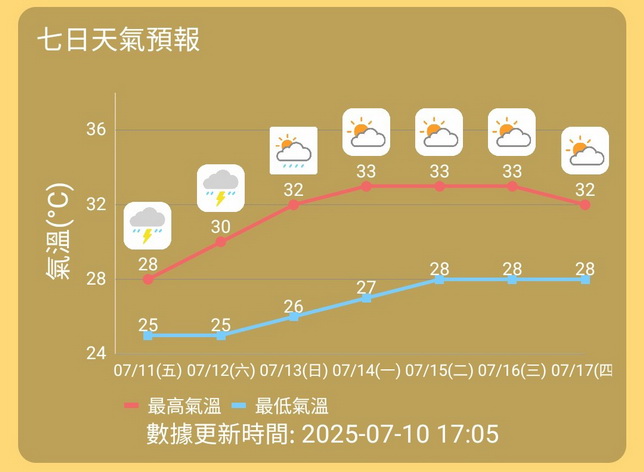氣象局預測下周日初時仍有幾陣驟雨,隨後天色逐漸好轉,多雲但部份時間有陽光,最高氣溫將重上32度。預測下周一至下周三天色較為明朗,天晴酷熱,最高氣溫達33度。