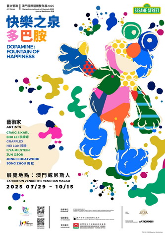 特展《快樂之泉多巴胺》將匯聚九位來自亞洲、歐洲及美洲的國際當代藝術家包括Craig & Karl、李綺婷、GRAFFLEX、陸曦、Ilya Milstein、Jun Oson、Jonni Cheatwood及周松,聯乘全球知名《芝麻街》的不同角色,包括艾摩(Elmo)、大鳥(Big Bird)、伯特(Bert)及厄尼(Ernie)等。藝術家以古羅馬神話和多巴胺為靈感,結合各自的獨特風格進行創作,全方位探索當代藝術的無限可能。展覽把澳門威尼斯人標誌性的歐式建築場景轉化為色彩與神話交織的藝術舞台,並獨家展出多件特別為澳門創作的全球首發藝術作品。