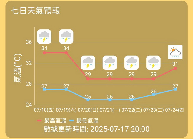 受高空反氣旋及熱帶氣旋外圍下沉氣流影響,周四本澳各區最高氣溫達攝氏約33度至35度,雖較日前下降一度左右,但感覺頗為悶熱。氣象局預測周五至周六天氣仍然酷熱,多雲及有短暫陽光,有幾陣驟雨及雷暴,氣溫約為27度至34度,高溫提示由此前的橙色降為黃色。