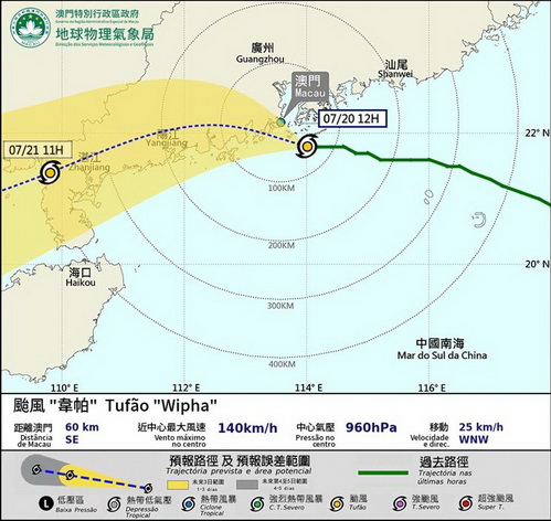 氣象局指颱風「韋帕」過去數小時進一步增強並穩定向偏西移動,按現時預測路徑,「韋帕」稍後將正面吹襲本澳,並為本澳帶來顯著影響,伴隨狂風大驟雨及雷暴,風力有機會達12級。因此該局將於中午12時30分改發十號風球。