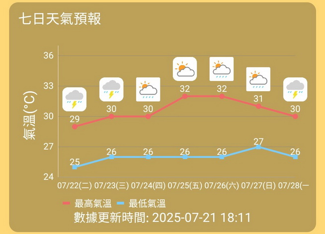 當局預測周三初時仍有幾陣雷暴,並有幾陣驟雨,多雲但短暫時間有陽光,吹三至四級東至東南風及有陣風,氣溫約為26度至30度;周四風力開始緩和,吹二至三級偏東風,多雲和短時有陽光,仍有幾陣驟雨,氣溫維持在26度至30度。