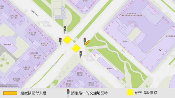 調整措施包括已適度擴闊長者公寓一側東北大馬路的行人道,改善行人通行環境;同時優化東北大馬路與勞動節大馬路交界的交通燈號設置,在原有臨時交通安排的基礎上延長行人過路時間,確保長者及有需要人士通行安全。此外,交通事務局正研究在東北大馬路與勞動節大馬路交界處增設黃格標記的可行性,以完善該區的交通狀況。