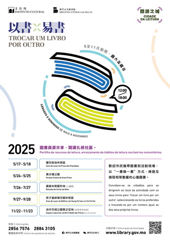 「以書易書」活動於五月至11月期間按單月份推出,七月份活動將於7月26日及27日一連兩天於嘉路米耶圓形地 (三盞燈)設置圖書交換攤位,活動以「一書換一書」的形式進行,參與者只需攜帶符合換書規則的書籍到活動現場,交予工作人員審核後,即可挑選並換取等量的心儀圖書。同時,現場設有澳門公共圖書館服務展板,介紹各項資源與服務,方便市民瞭解掌握,提升閱讀興趣,推動社區閲讀風氣。