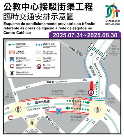 【本報消息】配合南灣大馬路近公教中心路段接駁街渠、水管、電纜、管道、天然氣管道鋪設、道路整治及拆卸臨時行人道走廊工程第二階段施工,經跨部門協調,7月31日至8月30日期間南灣大馬路及水坑尾街部份路段實施有限度通車,而水坑尾街公教中心對開之行人路則繼續禁止通行,由八角亭或南灣大馬路往返美麗街和天神巷一帶之行人需使用行人天橋。