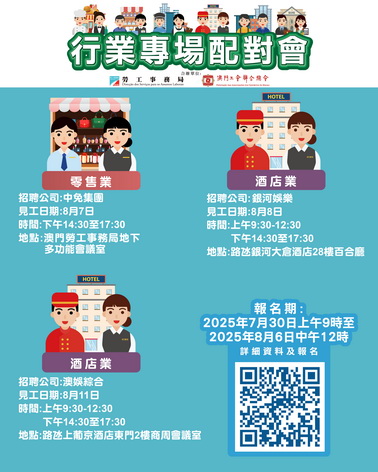 8月7日下午零售業配對會在勞工局地下多功能會議室舉行;8月8日全日酒店業配對會在澳門大倉酒店28樓百合廳舉行;8月11日全日酒店業配對會在澳門上葡京二樓商周會議室舉行。報名日期7月30日上午九時至8月6日中午12時。