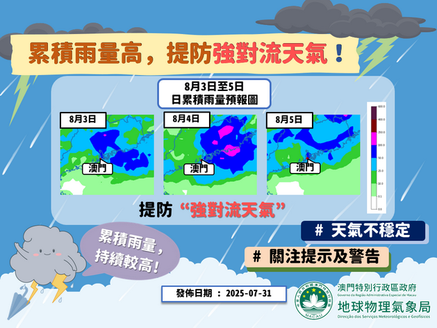 【本報消息】本澳氣象局預料隨著西南氣流於周末開始轉趨活躍,下周初廣東沿岸天氣將變得不穩定,可能出現暴雨天氣,按現時預測下周日至周二(8月3日至5日)珠江口地區累積雨量較高,部分地區連續單日累積雨量可能超過100毫米,因此本澳下周初雷雨天氣將會變得更為頻密,出現暴雨的風險高。