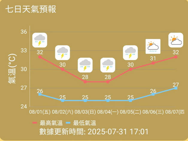 局方又預測由周六起雲量增加,陽光暫時休息,當日大致多雲及間中有驟雨,稍後雨勢漸轉頻密及有幾陣雷暴,吹三至五級西南風及有陣風,氣溫稍降至25度至30度;下周日天氣持續不穩定,多雲、有驟雨及雨勢有時頗大,且間中有雷暴,吹四至五級西南風及有陣風,氣溫降至約25度至28度。展望雨勢將由下周二稍後的時間開始減弱,預測陽光最快要到下周三才會露面,最高氣溫也會回升至31度。