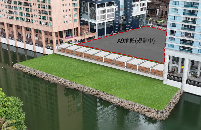 另一方面,為盡早提供臨時開放空間給公眾使用,公建局將分階段開展臨時工程,包括在A9地段沿湖邊建造臨時步道,以連通周邊建築物的柱廊,以及於A4地段回填基坑至地面層後串聯鄰近A3地段建造臨時廣場空間,地庫將重新規劃為公共停車場。相關措施可有效改善三幅用地的環境衛生狀況,滿足街區美化市容的要求。