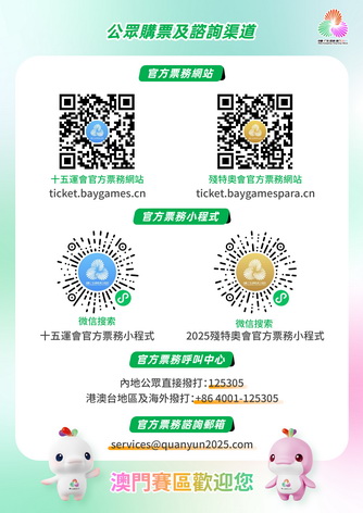 粵港澳三地首次實施「一個平台,三地購票」,有興趣購票之人士,由即日起可先通過官方票務網站或官方票務小程序完成實名註冊,註冊成功後即可於項目門票開售時登入平台購票,公眾聲留意相關賽區的門票須知及條款。為更好地服務購票公眾,15運會和殘特奧會組委會設立票務呼叫中心,內地公眾可直接撥打125305,港澳台地區及海外可撥打+86 4001-125305,或電郵至services@quanyun2025.com查詢。