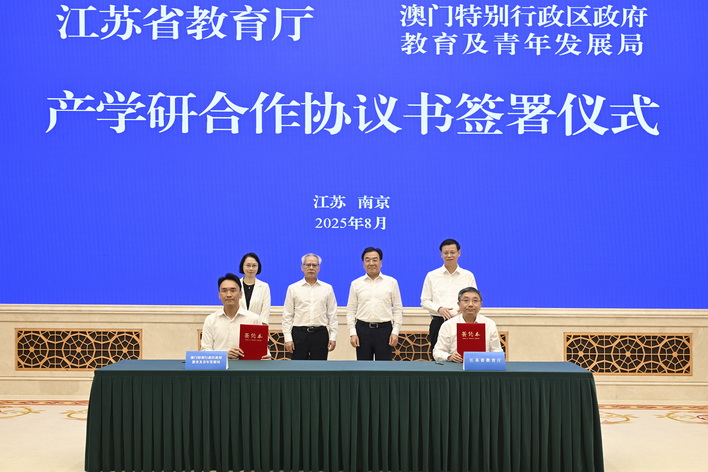岑浩輝與信長星在會面後共同見證了《江蘇省教育廳與澳門特別行政區政府教育及青年發展局推動產學研合作協議書》的簽署儀式。通過合作協議,促進蘇澳兩地教育領域的交流合作,雙方在已有的工作基礎上進一步深化「教育—科技—人才」一體化發展,以發揮雙方在教育資源、成果轉化、服務平台等領域的互補優勢。