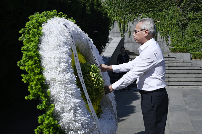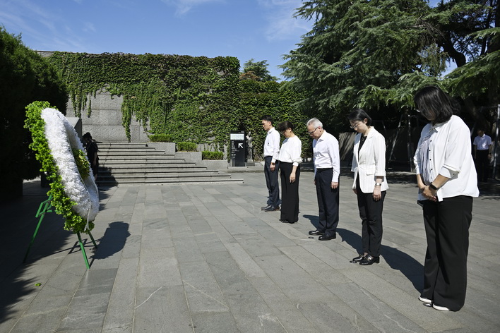 另外,行政長官一行上午在公面前也抵達侵華日軍南京大屠殺遇難同胞紀念館後,隨即為遇難同胞默哀,及後岑浩輝敬獻花圈、整理輓聯。隨後,一行到紀念館內的史料陳列廳和「萬人坑」遺址參謁,感受當年中華兒女浴血抗戰的悲壯歷程。