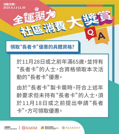 目前本澳正值風雨季節,天氣變化頻繁,且本次消費立減優惠使用期達三個月時間充裕。經科局與社工局呼籲長者及持殘評證人士無須急於前往服務地點辦理新版長者卡更換或關愛卡申領手續,確保出行安全。