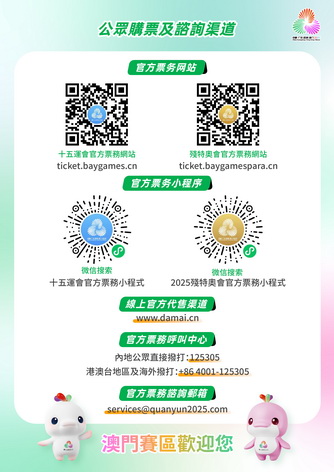 為更好地服務購票公眾,15運會和殘特奧會組委會設立票務呼叫中心,內地公眾可直接撥打125305,港澳台地區及海外可撥打+86 4001-125305,或電郵至services@quanyun2025.com查詢。其中15運會官方購票網站(ticket.baygames.cn),官方票務小程序(微信搜索):15運會官方票務小程序,;殘特奧會官方購票網站(ticket.baygamespara.cn),官方票務小程序(微信搜索):2025殘特奧會官方票務小程序。
