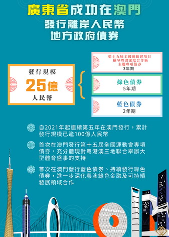 【本報消息】廣東省人民政府本月26日在澳門成功發行25億元人民幣離岸人民幣地方政府債券,是廣東省自2021年起連續第五年在澳門發行離岸人民幣地方政府債券,也是首次在澳門發行第15屆全國運動會項目的專項債券及藍色債券。至今,廣東省在澳門發行地方政府債券的規模累計已逾100億元。澳門金融管理局對債券成功發行致以祝賀,並感謝國家財政部、廣東省人民政府對澳門新金融業態發展的支持。