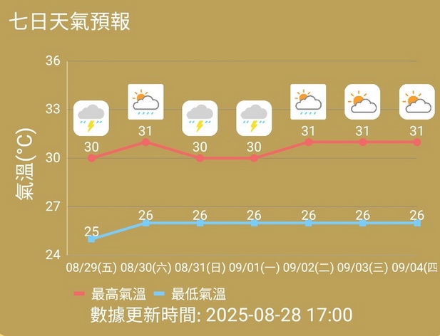 氣象局預測周六仍有幾陣驟雨,多雲並有短暫時間的陽光,氣溫為26度至31度,吹四至五級偏東風及有陣風,尚有開學裝備需要添置的家長和學生最好把握時間在周六完成,因為下周日至下周一天氣又會轉差,本澳將大致多雲,並有幾陣驟雨及雷暴,氣溫也會略降至26度至30度。