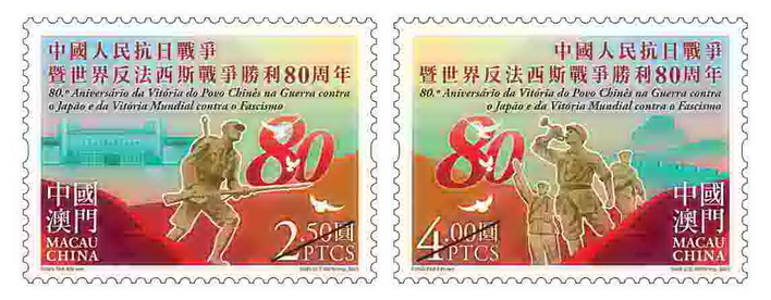 郵電局在新郵品新聞發佈會上介紹,「中國人民抗日戰爭暨世界反法西斯戰爭勝利80周年」郵品包括兩枚郵票,以抗日紅軍英姿作為視覺重心,展現中國軍民在抗戰時期的雄心壯志。將士們昂首挺胸,朝向白鴿飛翔的光明方向,勇敢無懼邁向和平之路。郵票背景分別選用中國人民抗日戰爭紀念館和萬里長城,紀念英勇的抗日戰士為國捐軀的不朽功績,同時彰顯保家衛國的堅定決心。