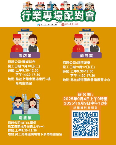 9月10日全日酒店業專場配對會在澳門上葡京酒店二樓商周會議室舉行;12日全日酒店業專場配對會在澳門銀河國際會議展覽中心舉行;15日上午電訊業專場配對會在勞工局地下多功能會議室舉行。報名日期由9月4日上午九時至9月9日中午12時。