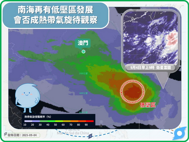 同時,預料未來一兩日南海中部將有一低壓區發展,周末至下周初大致移向廣東西部沿岸。由於該低壓區將以較快速度靠近廣東沿岸,預料其強度發展將較慢,因此能否進一步發展為熱帶氣旋仍待觀察。