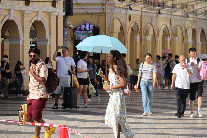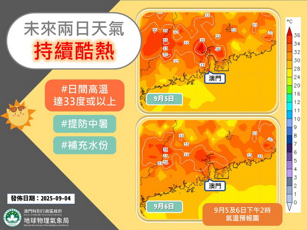 根據氣象局七日天氣預報,本澳周五天氣酷熱,天晴,部份時間多雲,初時有一兩陣驟雨,吹二至四級東至東南風,氣溫約為攝氏27至33度,相對濕度介乎百分之60至95之間,預測最高紫外線指數約為11,級別屬於極高。