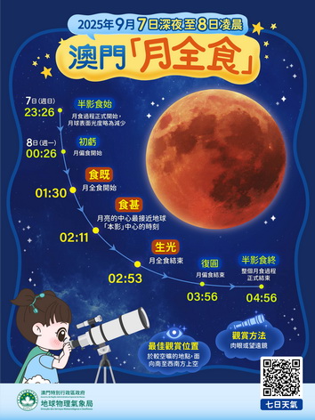 另外,氣象局提醒本澳將於下周日深夜至下周一凌晨迎來一次「月全食」天文現象,預計當日月出時間為下周日下午6時23分,月偏食開始於下周一凌晨0時26分,月全食開始於凌晨1時30分,食甚即月中心最接近地球本影中心的時刻為凌晨2時11分,月全食結束於凌晨2時53分,月偏食結束於凌晨3時56分。