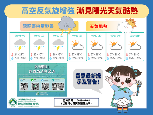 「塔巴」登陸後移入內陸及逐漸減弱,但氣象局提醒受其殘餘雲帶的「風尾雨」影響,周一至周二初時本澳天氣仍不穩定,有大驟雨及雷暴;隨著高空反氣旋逐漸增強,周四起驟雨會減少,陽光將會增多,天氣將會再次變得酷熱,最高氣溫可達攝氏約33度,巿民要提防中暑和適時補充水份,避免長時間在戶外活動。