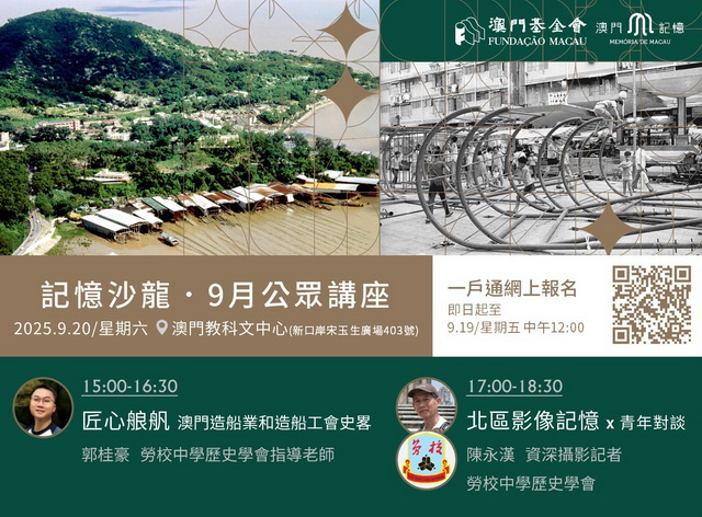 九月公眾講座將於9月20日下午於澳門教科文中心舉行,分別由勞校中學歷史學會指導老師郭桂豪於四時至四時半主講「匠心艆舤—澳門造船業和造船工會史畧」,以及由資深攝影記者陳永漢與勞校中學歷史學會於五時至六時半共同帶來的「北區影像記憶x青年對談」。