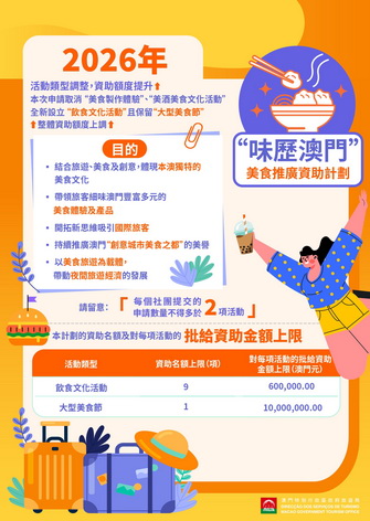 「味歷澳門」美食推廣資助計劃結合旅遊、美食及創意,體現澳門獨特的美食文化,帶領旅客細味澳門豐富多元的美食體驗及產品,開拓新思維吸引國際旅客,持續推廣澳門「創意城市美食之都」的美譽,以美食旅遊為載體,帶動夜間旅遊經濟的發展。此計劃的活動分為飲食文化活動及大型美食節兩個類型。