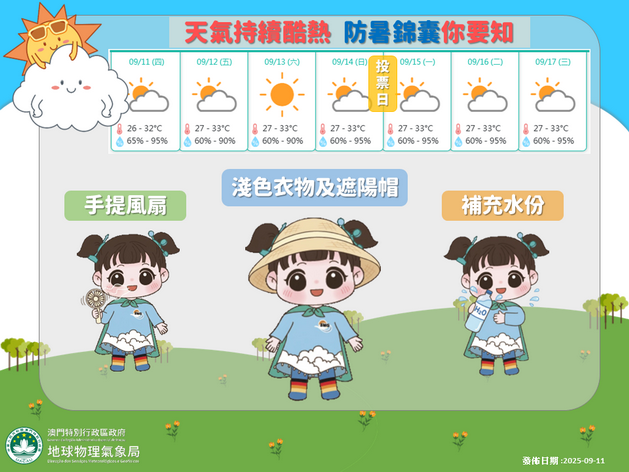 受高空反氣旋影響,本澳送走熱帶氣旋「塔巴」後天色已轉為明朗,氣象局周四發出特別推送,預告本澳未來數日會持續受高空反氣旋影響,風力較弱,日間天氣酷熱,最高氣溫達33度,市區會再高一兩度。至於9.14立法會選舉投票日的大日子,當局預測本澳初時或有一兩陣驟雨,但日間陽光充沛,天氣酷熱。因此,巿民積極外出參與選舉活動,踴躍行使投票權利之餘,可參考局方防暑錦囊,即穿著淺色衣物及遮陽帽、帶備手提風扇和適時補充水份,做好防暑準備。