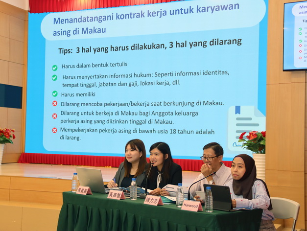 講座由法務局代表主講,並由歸僑總會代表提供印尼語的即時傳譯,內容聚焦外地僱員在澳門工作及生活所需注意的法律規範,包括《勞動關係法》、《公共地方總規章》、《預防和控制環境噪音》、《道路交通法》 等法規,旨在幫助外地僱員了解自身的權利與義務,以及違法行為的相應法律責任等。
