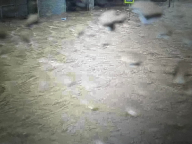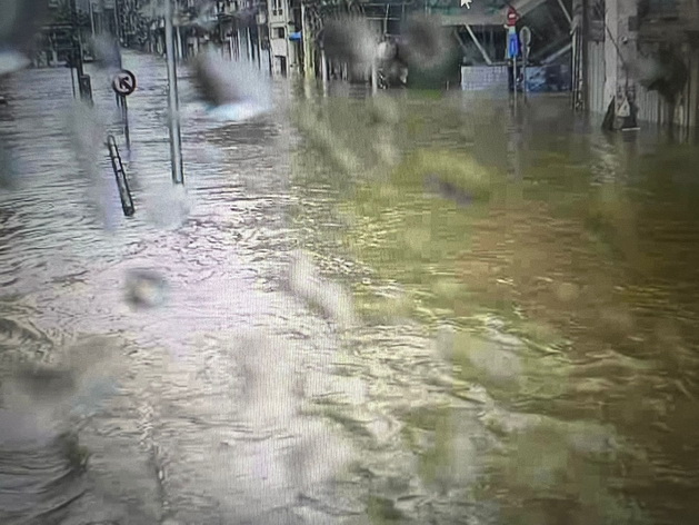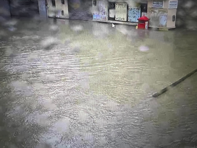 在沙梨頭至火船頭街一帶,現場水深過腰,已淹沒街道欄杆,路面上浮起大量雜物及垃圾,雨勢及風力不斷增大,周邊停泊的零星幾部電單車已被吹倒及淹沒。