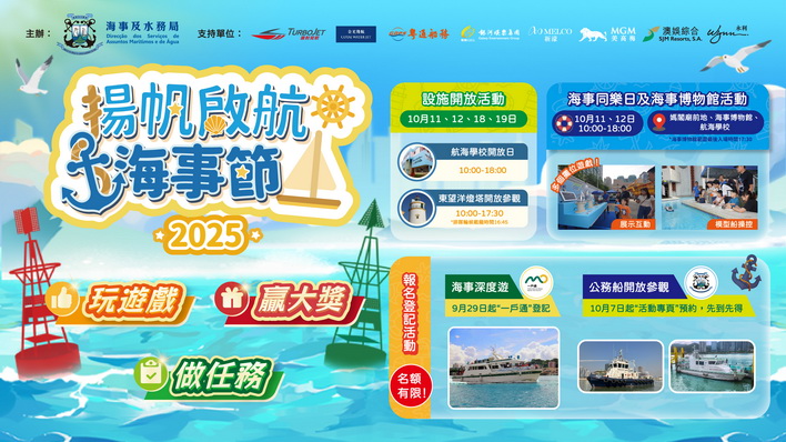 【本報消息】海事及水務局將於10月舉辦「2025揚帆啟航海事節」,透過海事設施開放、公務船參觀、出海考察、專題展導賞、教具展示、工作坊、攤位遊戲等多元化活動,向大眾推廣本澳的海事專業知識和航海歷史文化,詳情可瀏覽海事局網頁。