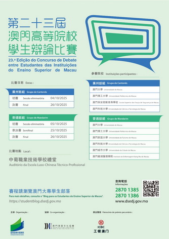【本報消息】為培養學生的邏輯思考能力、語言表達能力及應變能力,並加強高等院校間的學術交流。由教育及青年發展局主辦、澳門演辯文化協會協辦、工銀澳門獎金贊助的2025/2026學年「第23屆澳門高等院校學生辯論比賽」將於10月期間假中葡職業技術學校禮堂舉行。