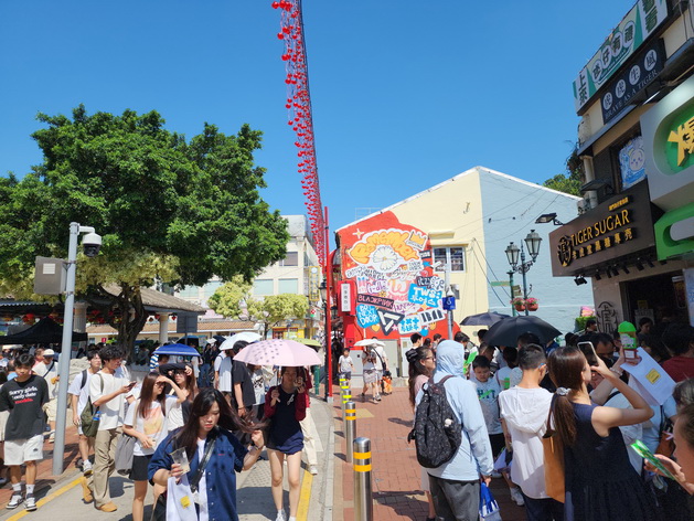 為確保國慶假期間氹仔舊城區及大三巴鄰近地區的人流及交通有序通行,政府除再次聯同商會社團於氹仔舊城區設置臨時行人專用區外,並首度在澳門關前後街設置臨時行人專用區;由於近兩日入境旅客人數已有所回落,對比上星期假期初期,周二當日即使官也街和大三巴街依然旅客人流如鯽,但兩處行人專用區的人流已明顯回落,其中以關前後街人流較為疏落。
