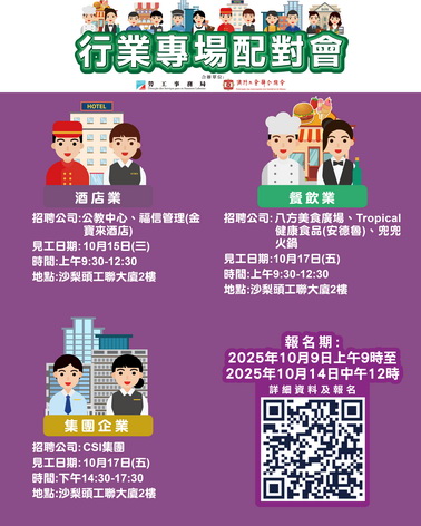 10月15日上午酒店業專場配對會、10月17日上午餐飲業專場配對會及同日下午集團企業專場配對會均在工聯二樓舉行。報名日期由10月9日上午9時至10月14日中午12時。勞工局和工聯將透過短訊通知欲尋找相關工作的求職者,凡收到短訊的求職者或有意參加配對會的澳門居民,可登入勞工局行業專場配對會專頁報名,名額有限,欲報從速。
