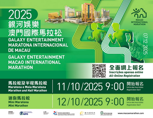 【本報消息】由體育局、銀河娛樂集團及澳門田徑總會主辦的「2025銀河娛樂澳門國際馬拉松」將於12月7日舉行。馬拉松及半程馬拉松項目將於10月11日上午九時開始接受報名,而迷你馬拉松的報名將於10月12日上午九時開始。各項目報名名額為馬拉松1,800名,半程馬拉松4,800名,迷你馬拉松5,400名。名額有限,報滿即止。