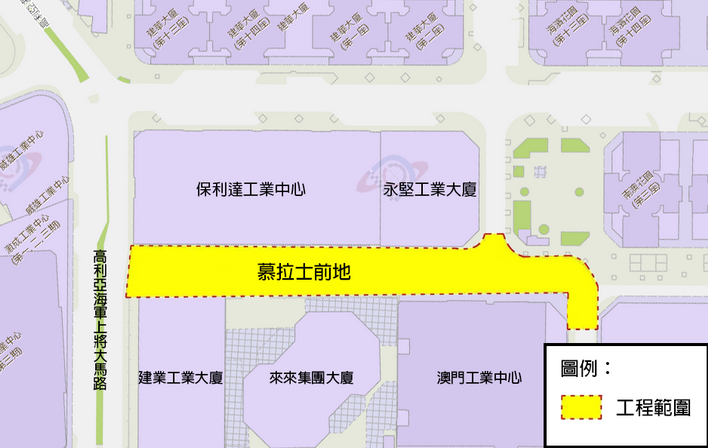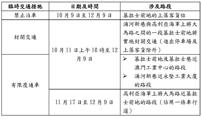 整項工程施工期為60個工作天。配合工程開展,介乎涌河新巷與高利亞海軍上將大馬路之間的一段慕拉士前地,於10月11日上午10時起實施封閉交通,周邊亦會實施相應的臨時交通安排,敬請公眾留意。