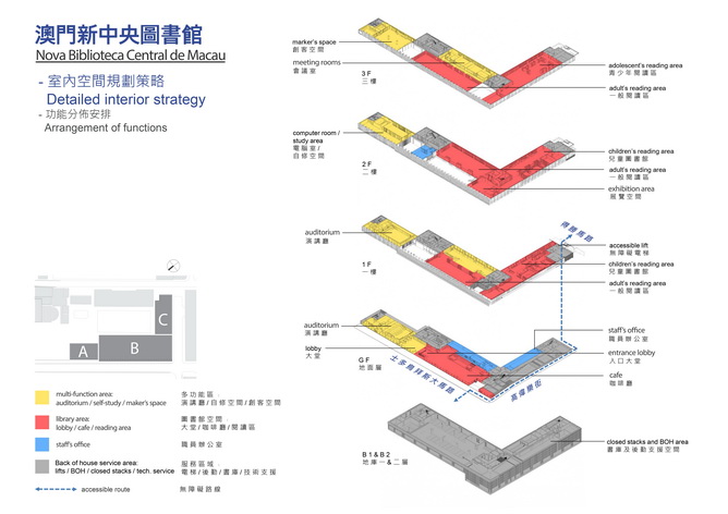 根據公建局公佈的新中圖等則透視圖顯示的室內空間規劃,新中圖呈「L」型,連地庫一層和二層後合計六層,入口大堂位於士多鳥拜斯大馬路一側,地面層將設有演講廳和咖啡廳,地上一至三樓為各類圖書館和閱讀區,並設有創客空間、演講廳、會議室、展覽空間和電腦室等。
