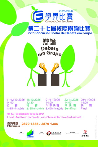 【本報消息】為培養學生的分析和邏輯思維能力,訓練其語言表達能力和技巧,由教育及青年發展局主辦、澳門演辯學會協辦、工銀澳門獎金贊助的2025/2026學年「第27屆校際辯論比賽」由10月至11月期間假中葡職業技術學校禮堂舉行。