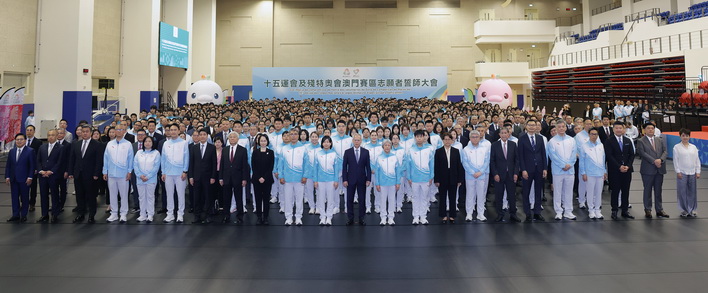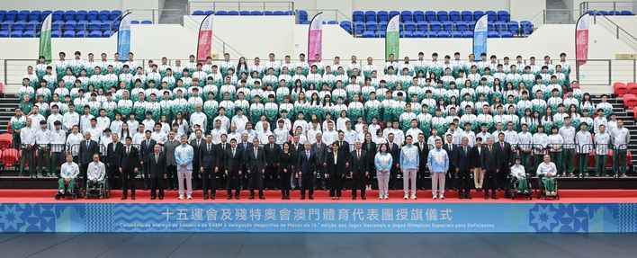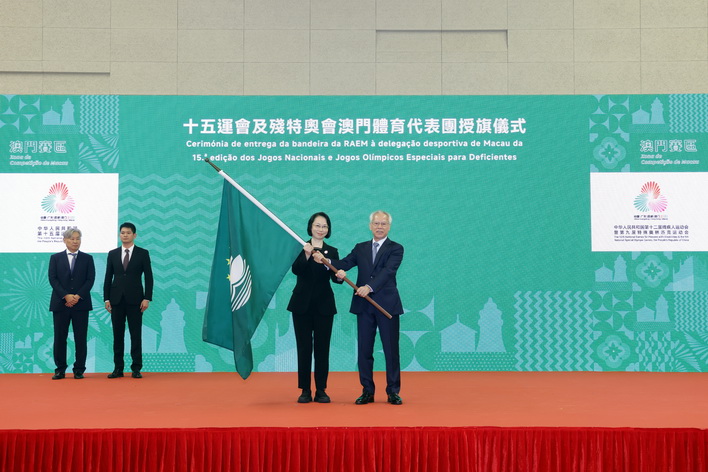 當日儀式在莊嚴的國歌聲和會歌《氣勢如虹》激昂旋律中拉開序幕。行政長官向15運會及殘特奧會澳門體育代表團代表、社會文化司司長柯嵐授予特區區旗及勉勵體育代表團取得佳績。本澳將分別派出超過400人的體育代表團參加15運會的23個比賽項目,包括水上運動(游泳、藝術游泳、跳水)、田徑、羽毛球、籃球(三人籃球、五人籃球)、拳擊、單車、獨木舟(靜水)、劍擊、足球、高爾夫球、手球、柔道、射擊、乒乓球、跆拳道、網球、鐵人三項、排球(室內排球、沙灘排球)、武術、射箭、曲棍球、賽艇、帆船;亦將派出超過180人的體育代表團分別參加全國第12屆殘疾人運動會的七個比賽項目,包括田徑、羽毛球、硬地滾球、輪椅劍擊、鐵人三項、游泳、乒乓球;以及參加第九屆特殊奧林匹克運動會的七個比賽項目,包括:田徑、羽毛球、籃球、滾球、足球、游泳、乒乓球。